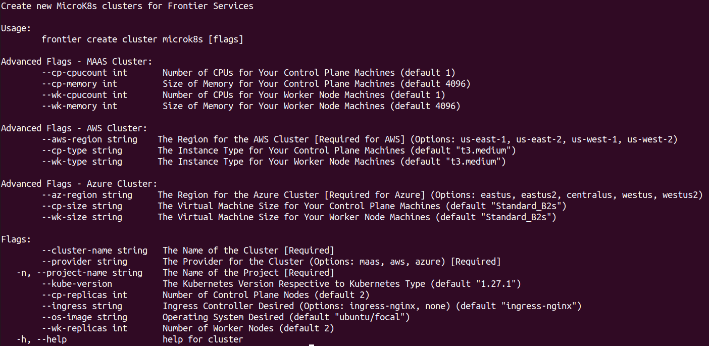When creating MicroK8s clusters through Frontier services, the client is provided with a large variety of options in how they would like their cluster to be created. These options vary pending on how the client sets up their flags in the command. We will divide this part of the tutorial into 4 different sections. We will cover each of the specific flags pertaining through clusters created through certain providers as well as global flags utilized across all of them. The providers that FKP currently supports are Metal-as-a-Service (MAAS), Amazon Web Services (AWS), and Microsoft Azure.