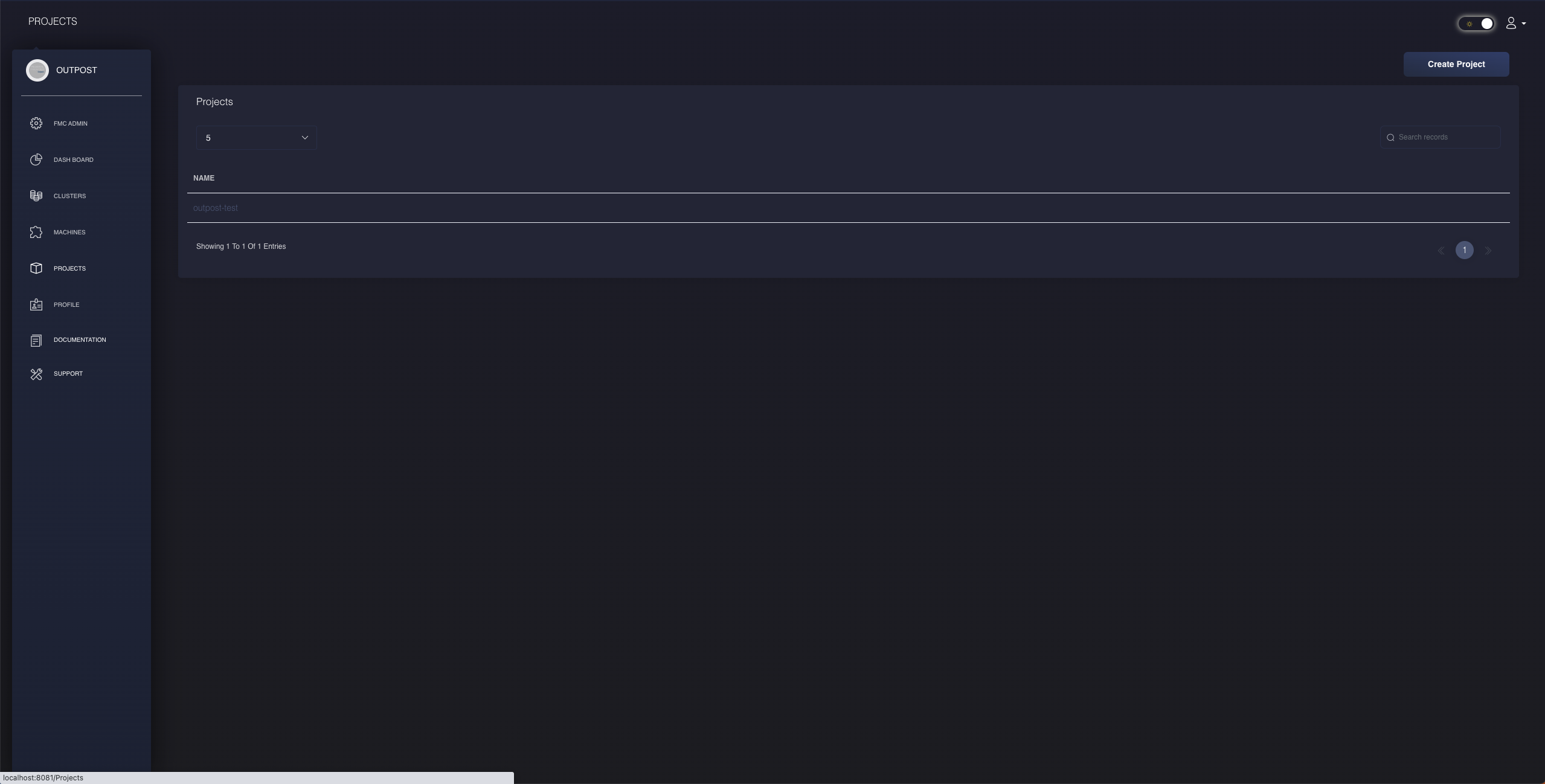 FKP users will be able to view all active projects within their organizations FMC cluster. Navigating to the projects tab using the side navigation bar, project and frontier adminstrators can either create new projects or destroy existing ones.
